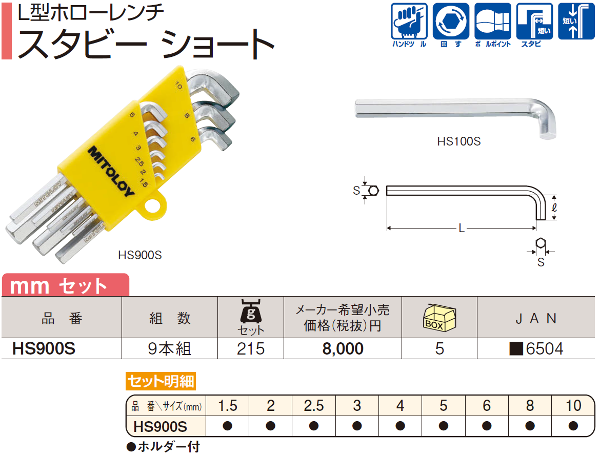 L型ホローレンチ スタビーショート 9本組セット 【発注コード】 【JAN】 L型ホローレンチ スタビーショート 9本組セット 作業用工具 作業工具・仕上工具 作業工具・仕上工具 MITOLOY ¥ 5,600 数量 (セット): 0 カートに入れる
